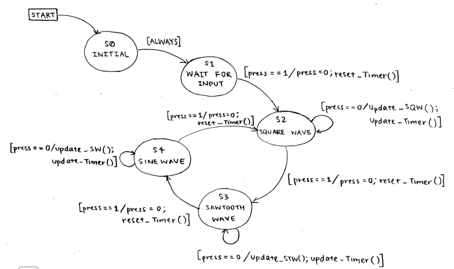 Using a variable that we assign with on (1) and off(0) values, we allow for the button to effectively switch on and off and move through the FSM.